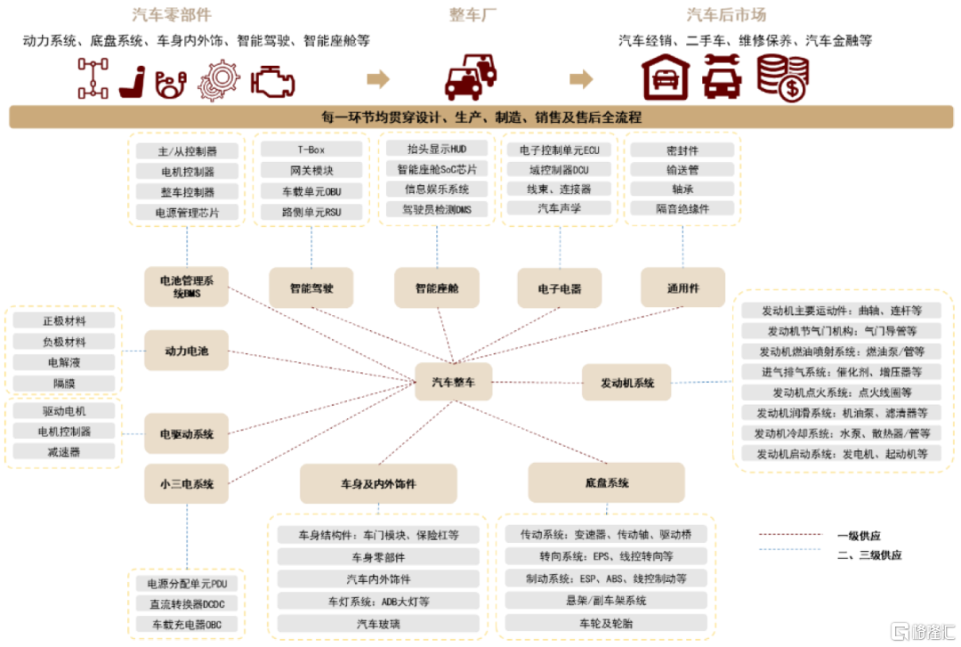 汽车产业链,以整车为核心,上游是汽车零部件,下游是后市场。如图表14.1所示,汽车产业链以整车为核心环节;整车核心零部件包括动力系统(发动机变速箱或者电池电机电控)、底盘系统、车身及内外饰、电子电器、通用件,以及新兴出现的智能座舱、智能驾驶等,每个核心零部件可继续拆分为细分零部件,最终追溯至钢材、铝、铜、石油、塑料粒子等大宗原材料;整车下游包括汽车金融、汽车保险、汽车租赁、维修保养、汽车用品及二手车等后市场领域。汽车供应链呈网状结构,配套体系庞大复杂,专业化分工和全球化程度较深。产业链以整车为中心,向外层层辐射为一级、二级、三级零部件供应商,三级供应商(tier3)主要向二级供应商(tier2)提供配套、二级供应商(tier2)主要向系统集成商(tier1)提供配套、系统集成商(tier1)再直接向整车企业供货,并同时提供对应零部件的系统解决方案,呈现专业分工和产业集群的特征。通常,系统集成商(tier1)具备与整车企业更深厚的客户关系与更强的同步开发能力,获取更高产业附加值,处于产业链金字塔上方。
