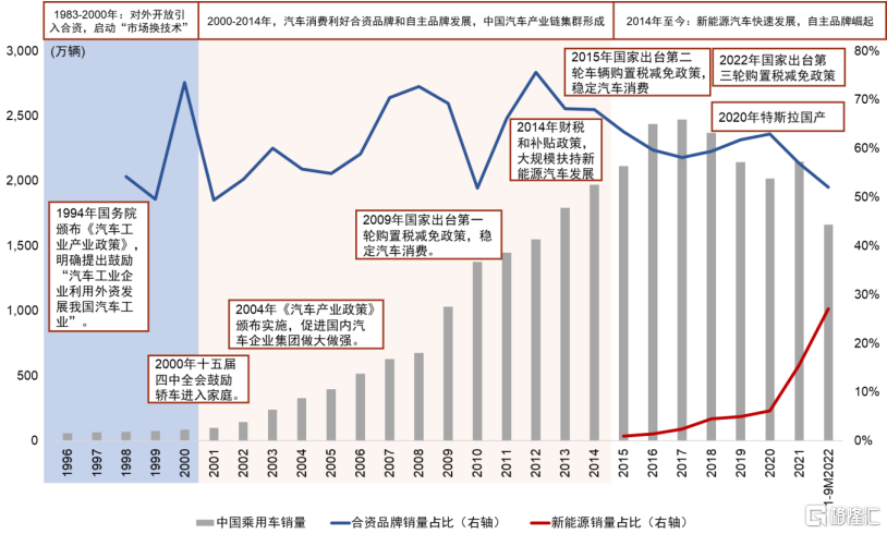 1)第一阶段,20世纪80年代至2000年,中国对外开放引入合资模式,希望通过“市场换技术”获得汽车核心技术和能力,北汽、上汽、一汽、长安等大型国有汽车集团与国际车企合资建立了上汽大众、上汽通用、一汽大众、一汽丰田、东风日产、长安福特等公司,引入海外车型的本地化生产组装,拉开了中国汽车工业发展序幕,实现了中国汽车工业的从无到有。随着合资车企的国产化率提升,中国汽车零部件配套逐步完善,从而带动了民营自主车企的诞生,吉利、长城等民营车企纷纷成立。偏向于供给端引导的技术引入模式的效果值得商榷,外资品牌的技术导入和国产化程度相对有限,中国自主品牌在核心技术的积累经历了漫长的过程。