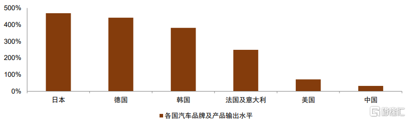 资料来源:Marklines,中金公司研究部 注:汽车品牌及产品输出水平,由各国别车企销量除以本国本土汽车销量计算得到