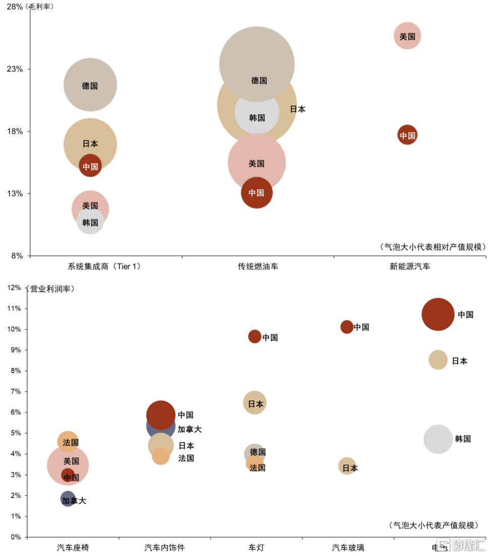 资料来源:各公司公告,Capital IQ,Wind,Marklines,中金公司研究部 注:1)出于数据可比性、可得性考虑,我们采用营业利润率刻画传统零部件与新能源零部件环节中各经济体的价值链地位,采用毛利率刻画各国的系统集成商(Tier1)与整车企业的价值链地位,均采用纵坐标显示,均参考相关企业2021年相应环节业务的财务数据;2)不同颜色的气泡代表不同经济体,气泡面积显示各经济体包含的相关企业2021年相应环节业务的营业收入总和从而代表各经济体在相应环节的产值;3)跨国公司所属经济体原则上以所有权为准