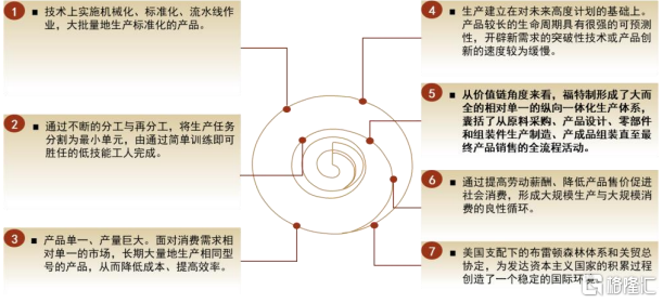 1913年,福特汽车创始人亨利·福特,采用装配的流水线生产方式大规模生产标准化车型,生产效率从1906年的年产100辆汽车提升至1925年平均每10秒钟生产1辆汽车,并推动产品单价下降;1916年福特T型车的售价仅360美元,汽车逐渐成为大众消费品[3]。如图表14.7所示,从供应链角度来看,福特模式囊括了从原料采购、产品设计、零部件制造、产成品组装直至最终产品销售的全流程活动,集团内部形成大而全、相对单一的整车-零部件纵向一体化的生产体系,充分发挥了汽车产业链的标准化、大规模、低成本等优势。