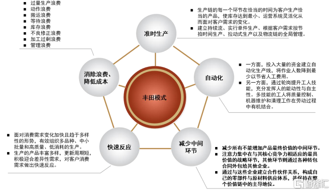 20世纪80年代以来,丰田制以消除浪费、降低成本为目标,以准时制和自动化为支柱,以改善作业为基础。如图表14.8所示,丰田模式缩短了直接参与的产业链长度,聚焦核心环节整车,集中发挥整车生产规模优势;并将上游零部件环节模块化和专业化,外包给零部件企业,以降低内部组织成本和提高运营效率;但通过交叉持股等方式掌控上游零部件的研发设计和制造,降低外部交易成本,最终打造自己的零部件与原材料供应链体系,从而保持价值链和规模优势的主导地位。