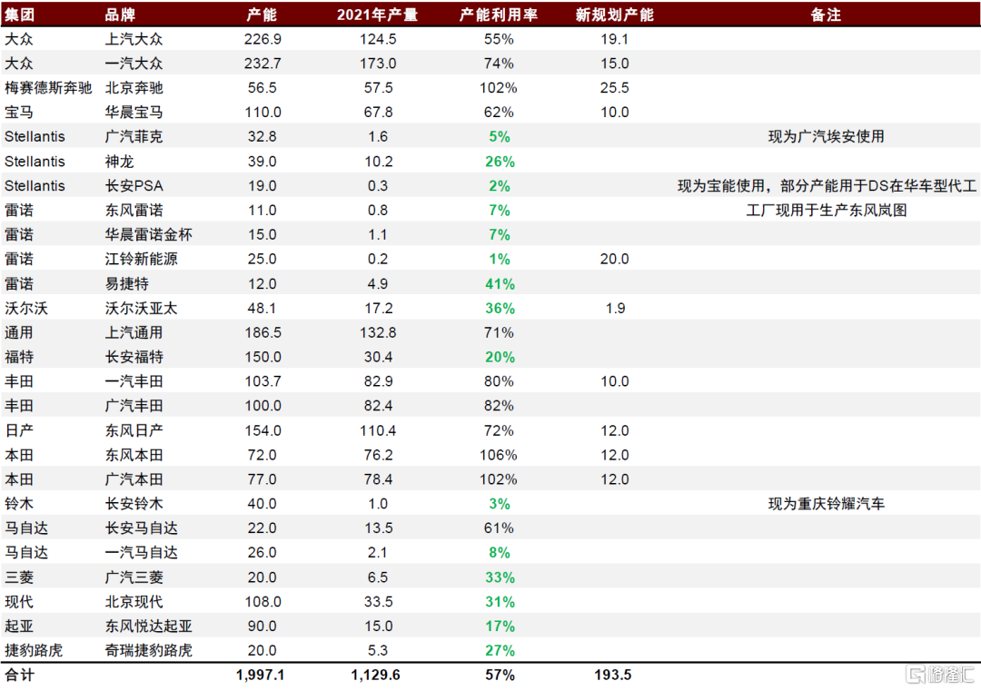 中国合资模式红利面临结束,警惕落后产能过剩。合资模式的“外资技术+中方生产”的合作基础正在快速消失,最终可能会走向销量下滑、低产能利用率、持续亏损、退出中国的结局。如图表14.14所示,我们统计测算得到,主要合资品牌汽车产能2195万辆,2021年实际产量1308万辆,产能利用率60%,展望未来,新能源渗透率加速提升,中国燃油汽车需求下行,产能利用率将快速下滑至50%以下,转型慢和弱势的合资与自主品牌都面临生死考验。从2017年中国汽车销量首次见顶至今,微观局部的低产能利用率长期存在,需警惕落后产能过剩带来的产业链风险。