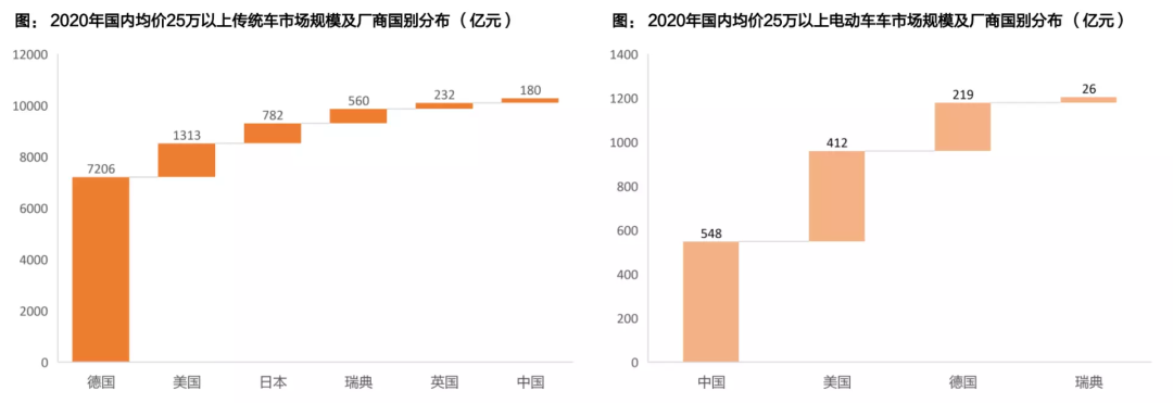 从2020年开始,新能源豪车市场就有了国内自主品牌的身影。天风证券数据显示,2020年国内生产均价25万元以上的电动车销量约35万,各车型加权均价34万,对应市场规模为1200亿元,目前仅为传统豪华车市场的1/10,但自主品牌以548亿元的规模位列榜首。