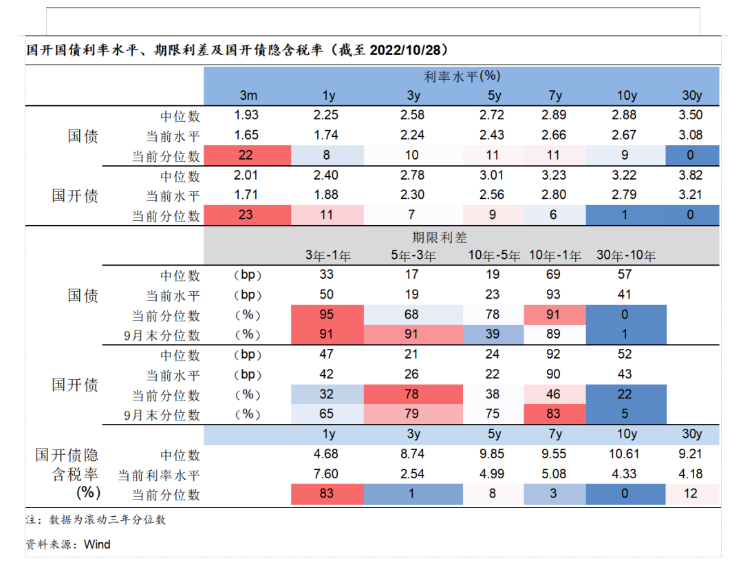 具体来看,Wind数据显示,相比于9月30日,10月28日1年期国债利率下行11BP至1.74%,10年期国债利率下行9BP至2.67%;1年期国开债利率下行1BP至1.88%,10年期国开债利率下行15BP至2.79%。