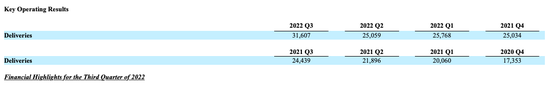 2022年Q3,蔚来的实际交付量为3.16万辆,同比增长29%,但整体处于交付指引的下限。2022年Q4,蔚来也开局不利,10月交付量为10059辆,环比减少819辆。截至目前,蔚来今年前10个月累计交付新车9.24万辆,同比增长32%,其中,单月最高交付量仍停留在6月份的12961辆。