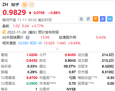 美股盘前,知乎涨3.77%,报1.02美元。公司11月10日回购2.05万股,斥资4.06万美元。