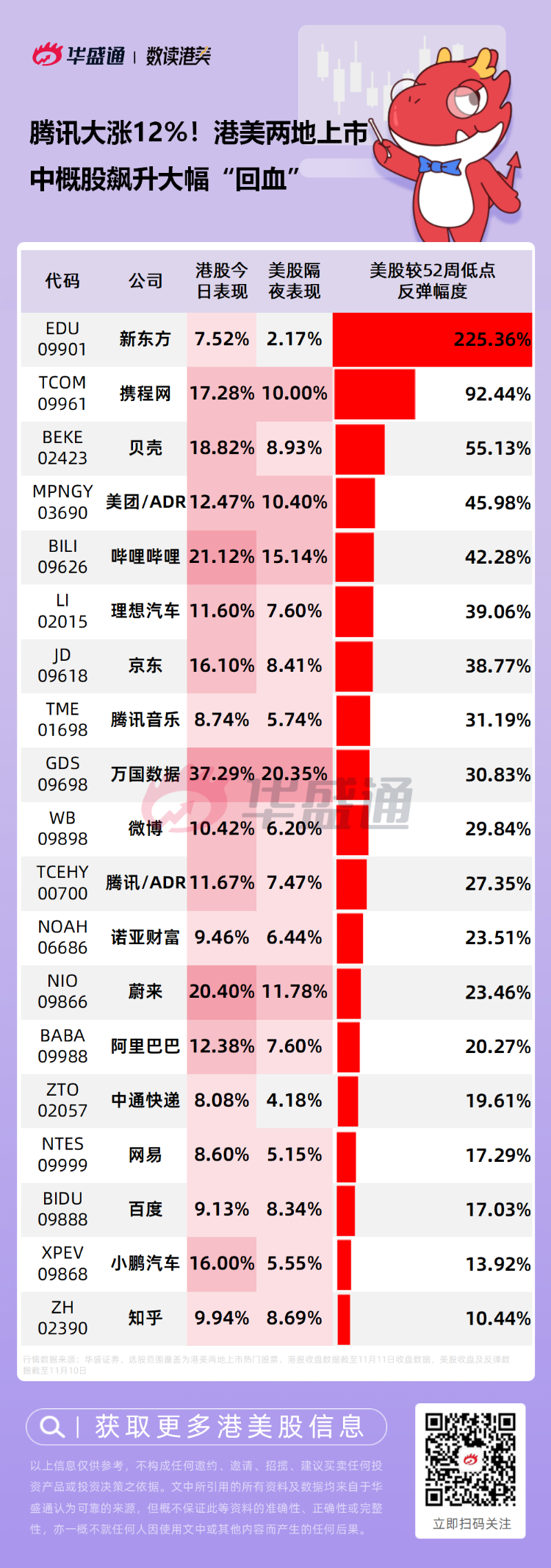 今日美股盘前,热门中概股纷纷走高,截至发稿,3倍做多富时中国50指数 $YINN 上涨10.27%,隔夜收涨17.71%;2倍做多沪深中国互联网指数ETF $CWEB 盘前上涨超9%,隔夜大涨16.42%。不少在港美两地同时上市的公司已较其52周低点大幅反弹,具体数据见下图: