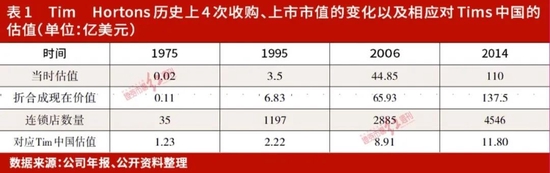 读者可以由表1得出如下结论:随着Tims Hortons的规模不断扩大,人们对Tim Hortons的估值也逐渐提高,对应Tims中国的估值从1.23亿美元提高到11.8亿美元。即使最高的11.8亿美元也要比最终的估值14亿美元低16%。