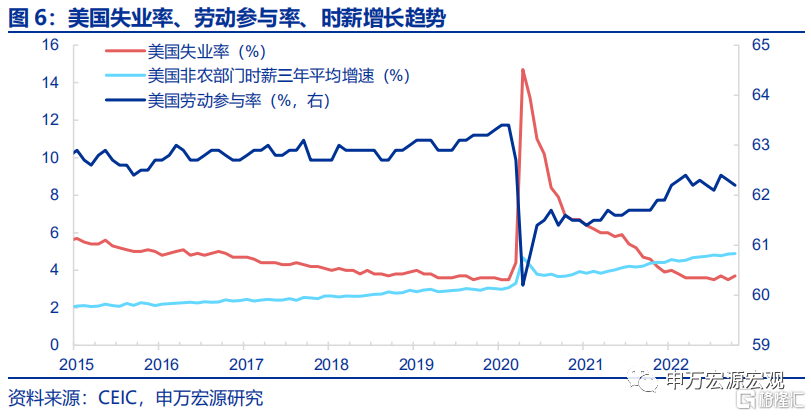 2)薪资通胀螺旋放缓,指向核心非居住服务通胀再超预期概率下降。在CPI中占比约25%的核心非居住服务在10月环比也出现放缓。核心非居住服务通胀和薪资通胀螺旋关系紧密。而上周公布的10月美国就业数据中失业率反弹、时薪增速放缓,叠加职位空缺已从高点回落,均指向美国就业市场紧张程度是趋缓的,从而核心非居住服务通胀再超预期的可能性也在降低。