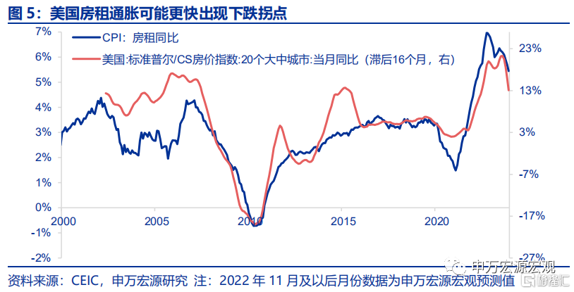 1)10月房租分项环比0.7%,较上月回落0.1个百分点,显示房租滞后于房价涨幅正在趋缓。今年以来,随着耐用品分项对于CPI同比贡献见顶回落,房租成为了支撑核心通胀位居高位并向上突破的最重要动力。既往规律,美国CPI房租分项滞后房价约5个季度,从而今年以来房租分项的强势,实际上反映的是美联储Taper之前大规模QE引发的房价涨势。随着今年以来先后启动的加息、缩表等货币紧缩操作,对利率相当敏感的房价已经出现明显下跌,未来数月间存在加速向房租传导的可能性。