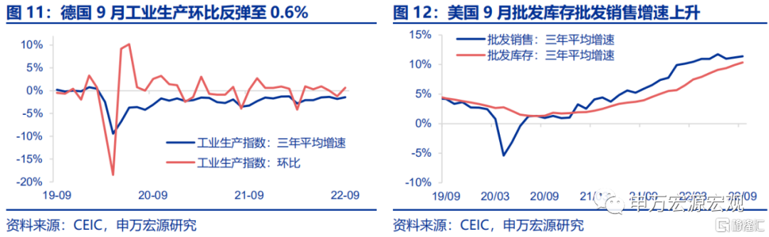 供给与就业:德国9月工业生产环比0.6%,较上月-1.2%反弹,三年平均增速回升至-1.5%,但能源价格飙升和供应链问题持续存在。9月美国批发销售、批发库存三年平均增速均有所提升,分别达到11.4%与10.4%。库存环比增速稍强于销售,反应美国消费动能正在逐步放缓。