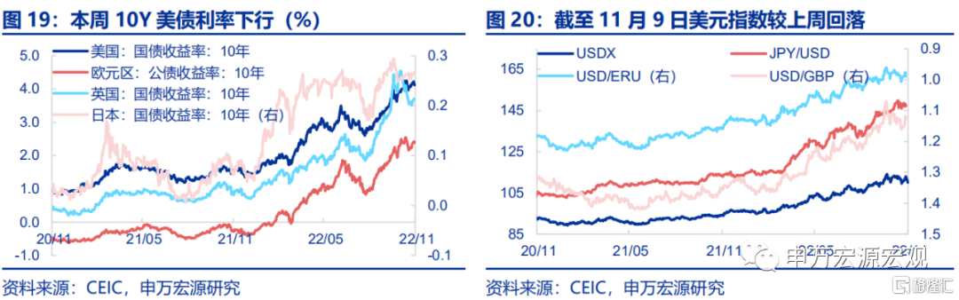 美联储未来快速转向的概率明显提升。10月美国通胀超预期下行的结构具有阶段性特征,当前至明年美国通胀下行速度可能持续快于市场预期。这意味着美联储本轮加息峰值可能更早出现、峰值水平可能更低,首次降息的时间也不排除可能提前至2023年三季度。当前市场预期美联储加息峰值已经下修至4.75-5.00%,较上周下降0.25%。这可能意味着美元指数的阶段性高位已经过去,对其他主要经济体货币汇率压力最大的阶段也可能已经渡过。我国资本账户开放程度有限,当前人民币有效汇率主要由强劲的经常账户顺差所驱动,CNY、CNH双边汇率也有望近期至明年重拾稳步回升之势。明年我国货币政策仍将以配合性促进内需恢复为主要目标,降准置换MLF是当前可预见的最经济高效的操作方式。需注意的是,美国明年经济表现如果好于预期,通胀下行将更快,美联储转向将更坚定,这一与常态情况不同的路径值得持续关注。发达经济跟踪:德国工业生产环比转正。全球宏观日历:关注美国零售销售数据。