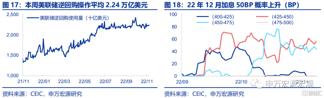 货币操作:本周美联储逆回购操作平均2.24万亿美元。美联储在11月议息会议上表态短期放缓加息节奏后,市场预期12月加息50BP的概率上升。