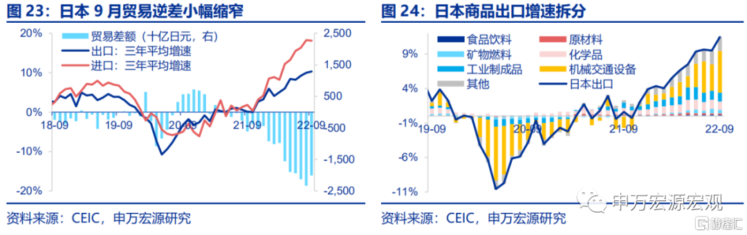 全球贸易:日本9月贸易逆差小幅缩窄。其中进口三年平均增速下滑至18.2%,出口三年平均增速上升至10.3%,因此贸易逆差收窄至2.01万亿日元。从出口结构来看,出口增速提升主要受机械及交通设备所推动。