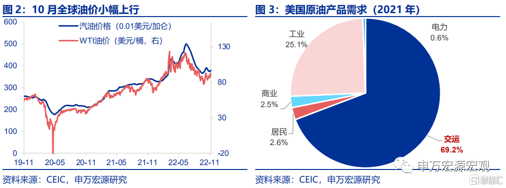 油价反弹致能源分项环比转正,但后续再度明显上冲概率较小。10月美国能源分项同比17.6%,虽然维持增幅缩窄趋势,但环比回正至1.8%,主要受到前期OPEC+超市场预期决定减产一度导致的油价小幅反弹的影响。但更需关注到的是随着发达经济体央行竞争式紧缩,工业品需求(特别是欧洲)下降较快,加之发达国家当前普遍防控措施强度已经较低,未来服务消费进一步改善的空间已经较为有限,未来数月内油价维持当前水平附近的概率预计大于超预期再度上冲的可能性。在近日进行的美国中期选举中,共和党接近至少重获众议院控制权,考虑到其对页岩油开采较为友善的政策态度,油价上行压力同样趋缓。