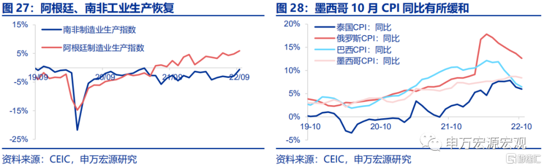 本周陆续公布多个新兴经济体失业率、工业生产和通胀数据。失业率方面,土耳其9月失业率上升至10.1%,韩国10月失业率仍处在改善趋势并保持在历史低位。工业生产方面,9月阿根廷和南非制造业生产恢复,三年平均增速俱上行。通胀方面,泰国、俄罗斯和巴西近几月CPI通胀呈持续下降趋势,墨西哥10月CPI也有所缓和,同比下降至8.4%。