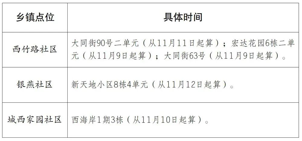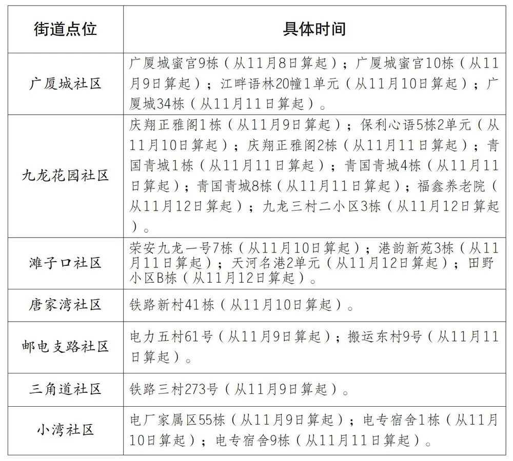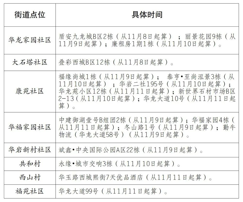 西永街道(7个):西园北街8号1号楼、2号楼(从11月8日0时起算),西城科景小区8栋(从11月10日0时起算),西科大道777号熙地锦绣城小区5栋(从11月10日9时起算),西城科景一期安置房小区2栋(从11月10日16时起算),西科大道777号熙地锦绣城8栋(从11月11日5时起算),润西山A区3栋(从11月11日11时起算)。