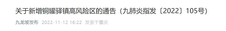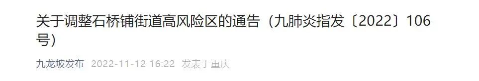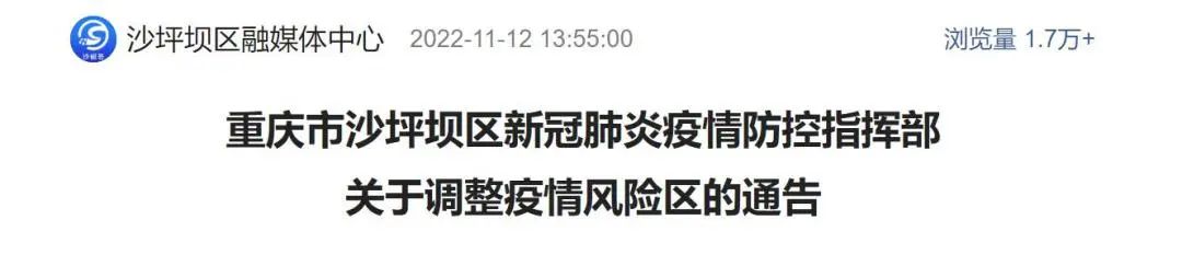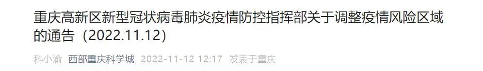 按照《新型冠状病毒肺炎防控方案(第九版)》相关规定,经重庆高新区新型冠状病毒肺炎疫情防控指挥部研究,报请市疫情防控指挥部批准,自2022年11月12日0时起,将部分区域调整为高风险区。具体如下: