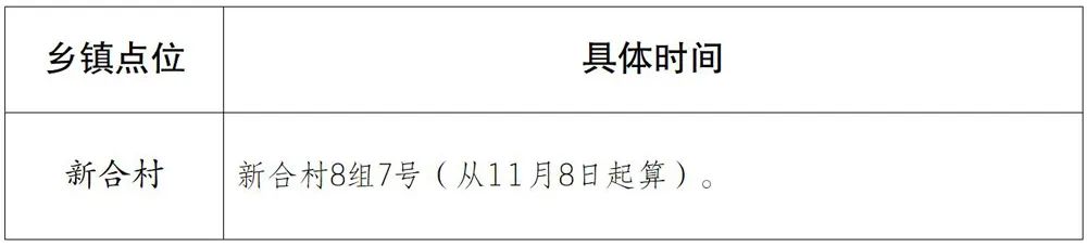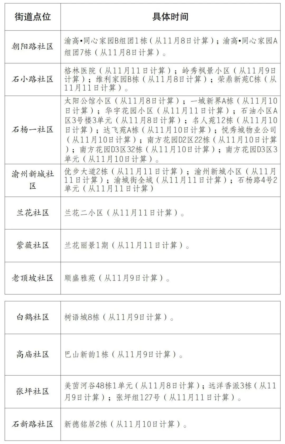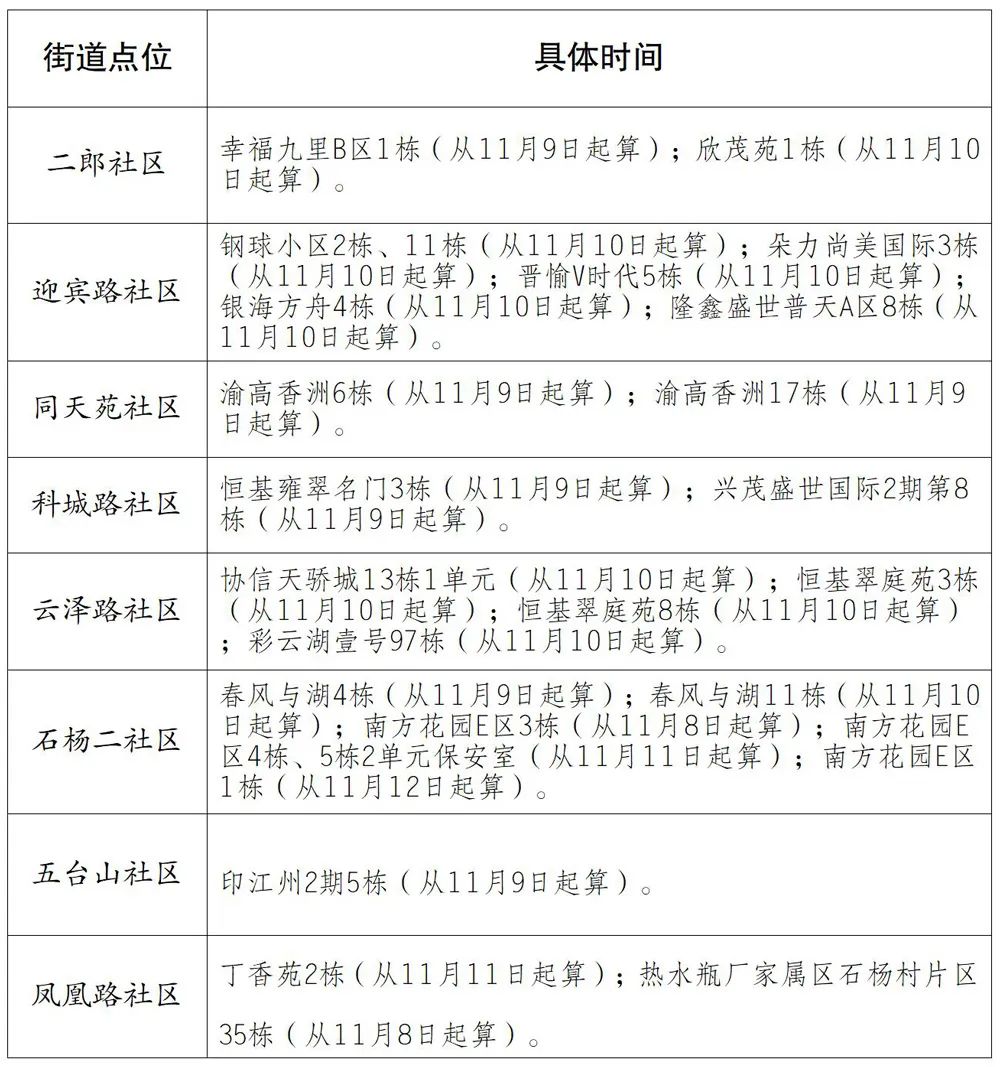 曾家镇(2个):中央花园A区7栋(从11月9日6时起算)、重庆溢哲渝科技有限公司(从11月11日12时起算)。