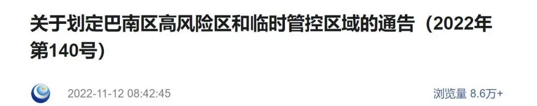 重庆市巴南区新型冠状病毒肺炎疫情防控指挥部发布关于划定巴南区高风险区和临时管控区域的通告(2022年第140号)。