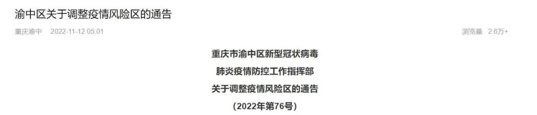 重庆市渝中区新型冠状病毒肺炎疫情防控工作指挥部发布关于调整疫情风险区的通告(2022年第76号)。