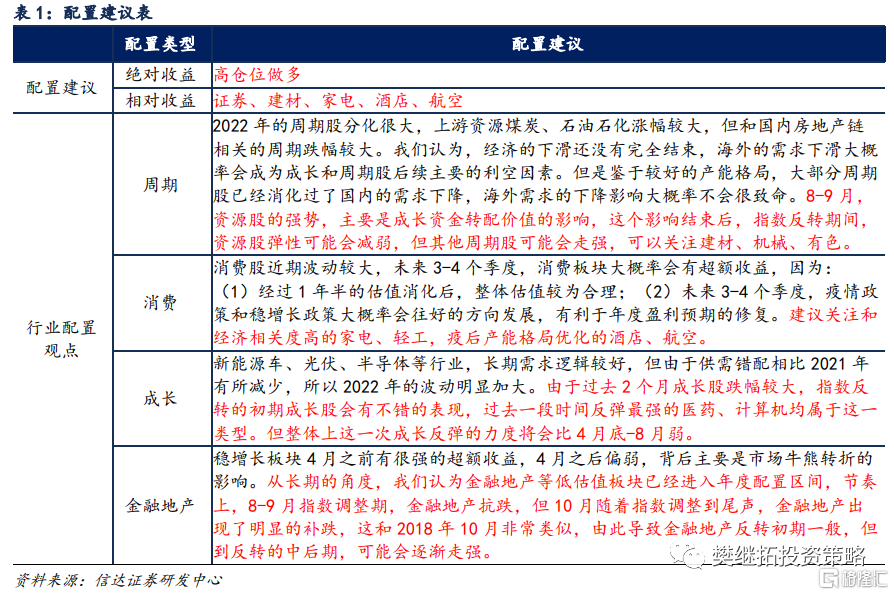 行业配置建议:成长超跌反弹,价值将会后程发力。如果是单纯的大反弹,大多是成长或周期等弹性较大的板块领涨,而且整个反弹的过程中,风格不会明显偏移。但如果是在牛市起点附近的反转或反弹,则可能会出现风格的偏移。这一次大概率会呈现成长搭台,消费周期唱戏的情况。(1)指数反转初期,部分成长超跌反弹。市场的风格虽然已经偏向价值,但由于过去2个月成长股跌幅较大,指数反转的初期成长股也会有不错的反弹,过去1个月反弹最强的医药、计算机均属于这一类型。按照历史经验,熊转牛初期成长股领涨,但随着熊转牛的深入,风格会蔓延到其他板块,这一次成长股上涨和4-7月不太一样,可能会呈现成长搭台,价值(消费周期类)唱戏的情况。(2)金融地产年度配置价值高,月度配置价值一般。银行地产的超额收益大多出现在经济下降后期到经济回升早期,在经济确定改善之前,反而更容易产生超额收益,当下到明年上半年均处在这一阶段,不过在指数反转初期,银行地产一般弹性较差。随着反转进入中期,可以关注弹性较大的非银和有政策变化的地产。(3)白酒调整是消费股细分行业中的强势板块补跌。去年以来,受疫情和房地产景气度下降影响,消费整体调整较多,白酒是之前一直相对较强的细分方向,近期出现了较为常见的熊市后期强势股补跌特征。风险释放完成后,可以逐步布局2023年疫情修复和稳增长相关的消费。建议优先关注疫后产能格局优化的酒店、航空,随着近期指数的反弹,可以逐渐增配和经济相关度高的家电、轻工等,熊转牛第一波,估值、超跌、年度逻辑比长期逻辑更重要。(4)周期中,地产链边际变化大,季度内反而可能更强。受益于可能存在的年底稳增长,可以关注之前跌幅较大的建材、机械和有色等周期股。