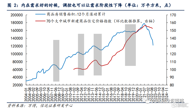 (2)房地产政策的变化,意味着房地产大概率不会一直处于下行周期。当然,每一次熊市底部的时候,都会有投资者说这一次和历史不一样,而去年以来最大的不一样是房地产,特别是下行的幅度和房价的波动。我们认为,近期的房地产政策变化,意味着即使长期房地产需求受到人口周期和收入波动的影响,从年度的角度,房地产依然存在出现年度性周期性上行的可能性。在2000-2020年的房地产长期上行周期中,历次房地产政策的紧缩均会带来房地产销售的年度级别下行,所以在下行周期中,我们依然可以相信房地产宽松政策会带来年度级别的房地产销售回升。