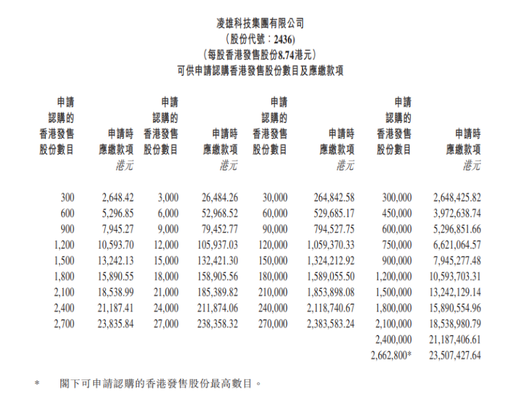 华盛资讯11月14日消息, 凌雄科技(02436)于2022年11月14日-2022年11月17日招股,拟全球发行5325.9万股,预期股份将于2022年11月24日(星期四)上午9时正(中国香港时间)开始发售。前往新股中心,申购新股>>