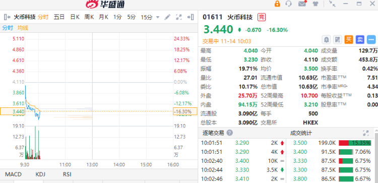 截至发稿,火币科技跌逾16%,报3.44港元。