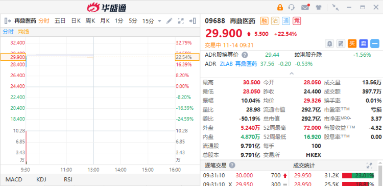 华盛资讯11月14日消息,港股早盘,生物医药股普涨,截至发稿,再鼎医药涨超22%,报29.9港元。根据联交所最新权益披露资料显示,2022年11月7日,再鼎医药获JPMorgan Chase & Co.以每股均价24.7812港元增持好仓1144.52万股,涉资约2.84亿港元。