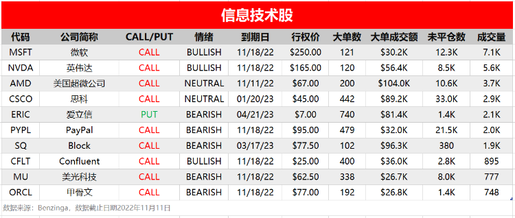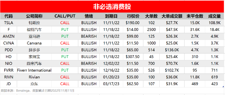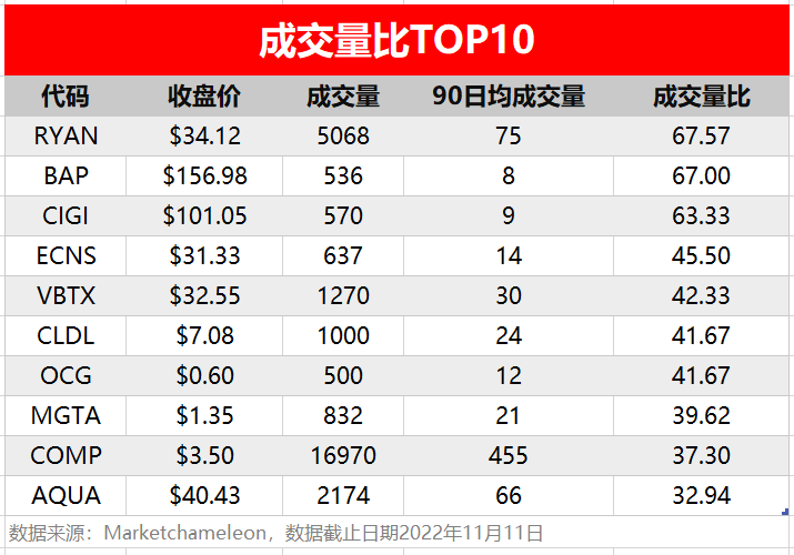 周五(11月11日),非必选消费、信息技术和能源板块相关个股出现较多活跃单,按照当日成交量排行,榜单TOP 10分别如下: