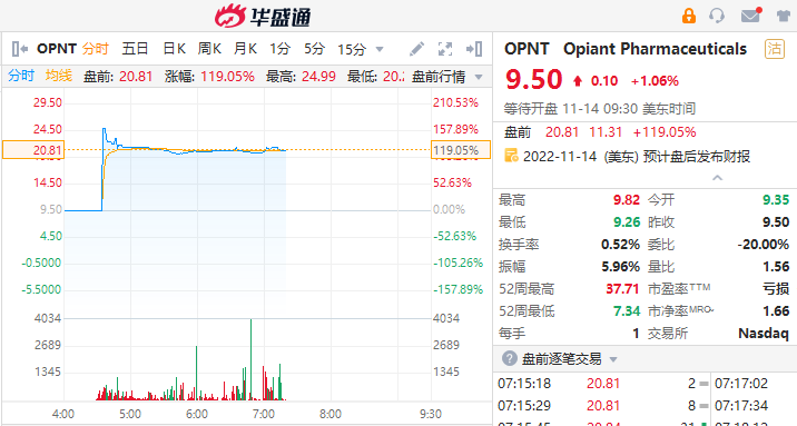 周一,英国阿片戒断药物制造商Indivior宣布以约1.45亿美元收购Opiant Pharmaceuticals(OPNT.US)。据悉,Opiant是一家在美国运营的特种制药公司,开发用于治疗阿片类药物过量的产品。截至发稿,Opiant盘前涨119.05%,报20.81美元。