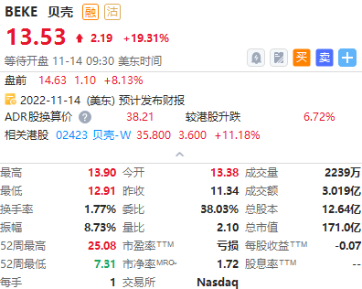 美股盘前,贝壳大涨超8%,报14.63美元。近日,人民银行、银保监会发布了一份《关于做好当前金融支持房地产市场平稳健康发展工作的通知》,出台16条措施支持房地产市场平稳健康发展,包括房地产信贷投放、“保交楼”金融支持、风险处置、阶段性调整金融政策等方面。受此利好消息的影响,港股和A股市场地产股近日来均连续大涨。