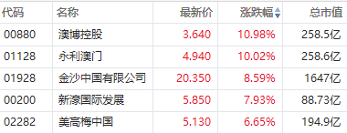 酒店娱乐板块,截至发稿,阿里影业涨近12%,永利澳门涨超10%,金沙中国涨超8%,复星旅游文化涨近3%,同程旅行涨超2%。