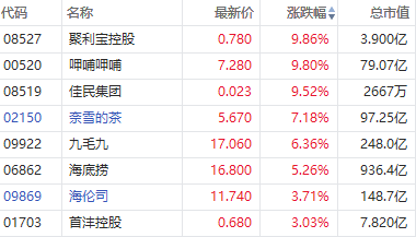 华盛资讯11月15日消息,港股盘中,消费概念股集体拉升。餐饮股方面,呷哺呷哺涨近10%,奈雪的茶涨超7%,九毛九、海底捞涨超5%,海伦司涨逾3%。