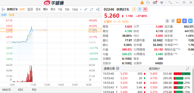 华盛资讯11月15日消息,快狗打车盘中股价一度暴涨超36%,截至发稿,现涨近28%,报5.26港元,公司将与机械人初创公司Rice Robotics合作推出自动送货机械人。