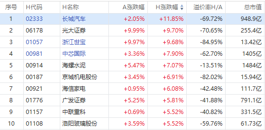 截至A股收盘,AH股涨幅前10如下: