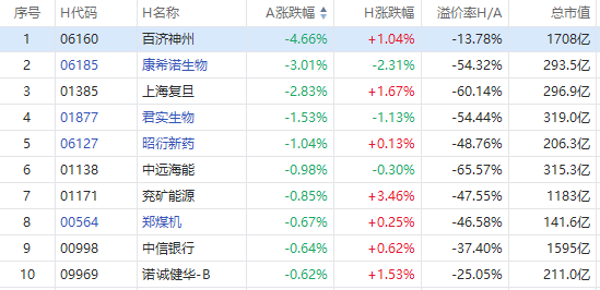 截至A股收盘,AH股跌幅前10如下: