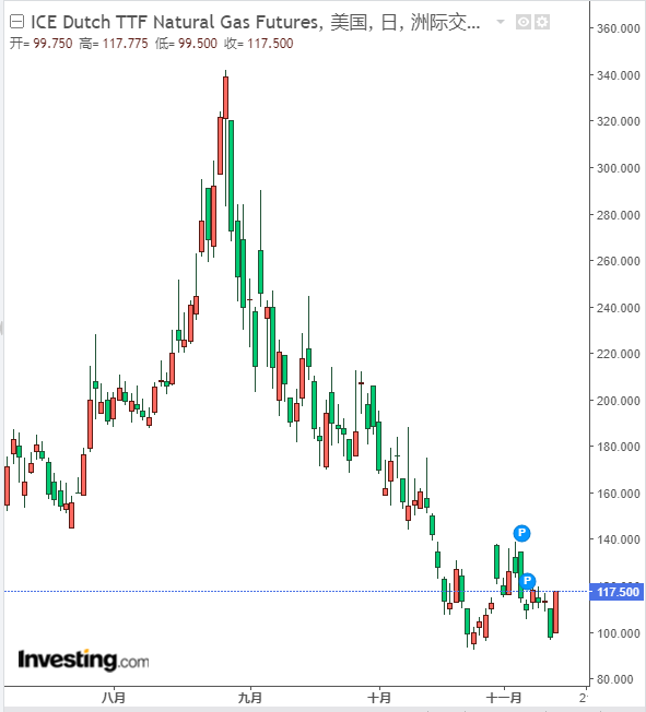 自9月份以来,欧洲积极从各种渠道储存天然气“过冬”,此外,市场预计欧洲今年会迎接一个“暖冬”,需求预期的减少使得天然气价格大幅度回落,目前天然气价格较搞高点已经回落近50%。