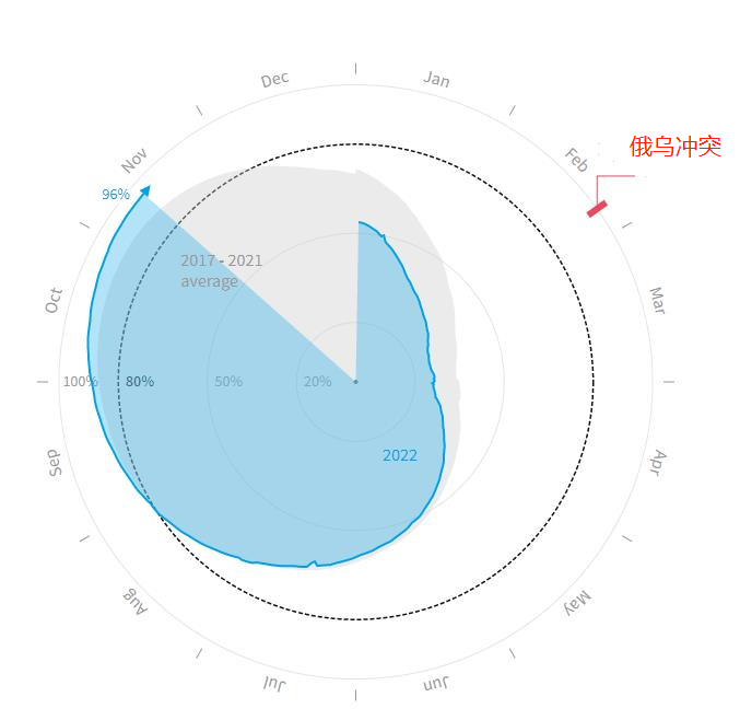 俄乌冲突后,欧盟制定了在11月1日之前将其储存点的填充率达到80%的目标,以便及时满足冬季的高需求。下图显示了整体欧盟储存点的填充率,截止到11月12日,整体的储存率已经远高于80%的目标了。