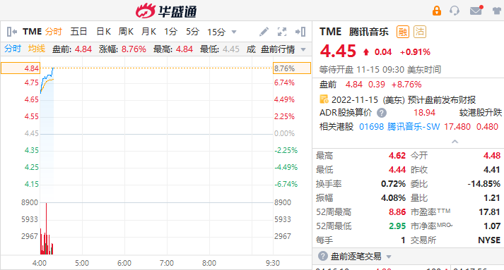 最新财报公布后,腾讯音乐美股盘前涨超8%。