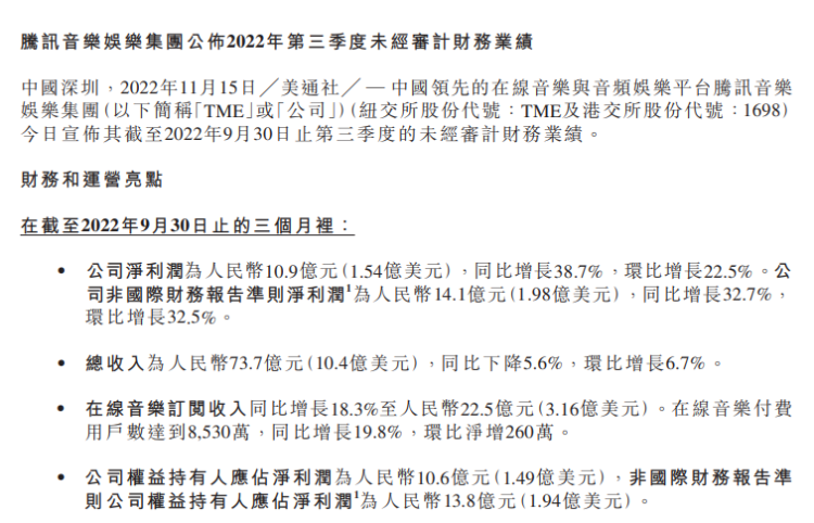 腾讯音乐发布截至2022年9月30日止3个月第三季度业绩,总收入为73.7亿元(人民币,单位下同),环比增长6.7%。公司净利润为10.93亿元,同比增长38.7%,环比增长22.5%。公司非国际财务报告准则净利润为14.1亿元,同比增长32.7%,环比增长32.5%。据悉,于2022年第三季度,在线音乐订阅收入同比增长18.3%至22.5亿元。在线音乐付费用户数达到8530万,同比增长19.8%,环比净增260万。