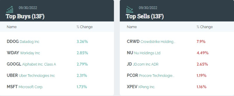 据统计,老虎环球基金三季度持仓总市值达108.93亿美元,环比下降约8.67%。前五大重仓股分别为,京东、微软、现在服务公司、Meta、Sea。老虎环球基金Q3增持Datadog $DDOG 、Workday $WDAY 、谷歌 $GOOGL 、优步 $UBER 和微软。其中,优步持仓数量较上季度上升1501%。新建仓Pagaya Technologies $PGY 、Applovin $APP 、台积电,以及PayPal $PYPL 总共5只个股。