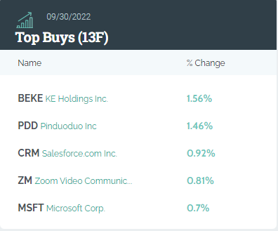 高瓴资本旗下HHLR Advisors公布了最新美股持仓数据。截至三季度末,HHLR持仓市值38.03亿美元,较二季度末有所缩水。重仓股方面,五大重仓股为百济神州 $BGNE 、赛富时 $CRM 、京东、DoorDash、传奇生物。阿里巴巴和拼多多等中概股继续得到HHLR的增持。新进买入方面,再度建仓Zoom $ZM ,共42万股。清仓方面,主要为Sea。