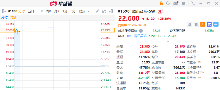 11月16日消息,影视娱乐股早盘走强,腾讯音乐涨超26%,云音乐现涨超18%。