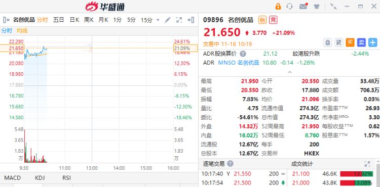 华盛资讯11月16日消息,名创优品股价大幅拉升,截至发稿,现涨超21%,报21.65港元。盘中一度触及21.95港元创上市以来新高,自11月14日起股价累计涨幅逾65%。11月14日,名创优品发布2023财年第一财季财报,毛利率、净利率均实现历史新高。