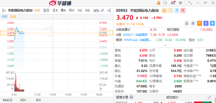华盛资讯11月16日消息,港股盘中,电力股集体走高,截至发稿,华能国际电力涨近6%,报3.47港元。华润电力涨超5%,大唐发电涨超4%,华电国际电力、中国电力涨超3%。