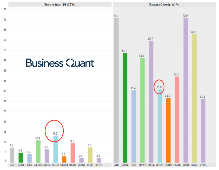 据统计,英伟达过去12个月的滚动PS超过13倍,不论是对比历史估值,还是横向的相对估值,这都是一个不低的数字。如下图统计,多家半导体公司的营收增长速度超过了英伟达,但PS比却低得多。