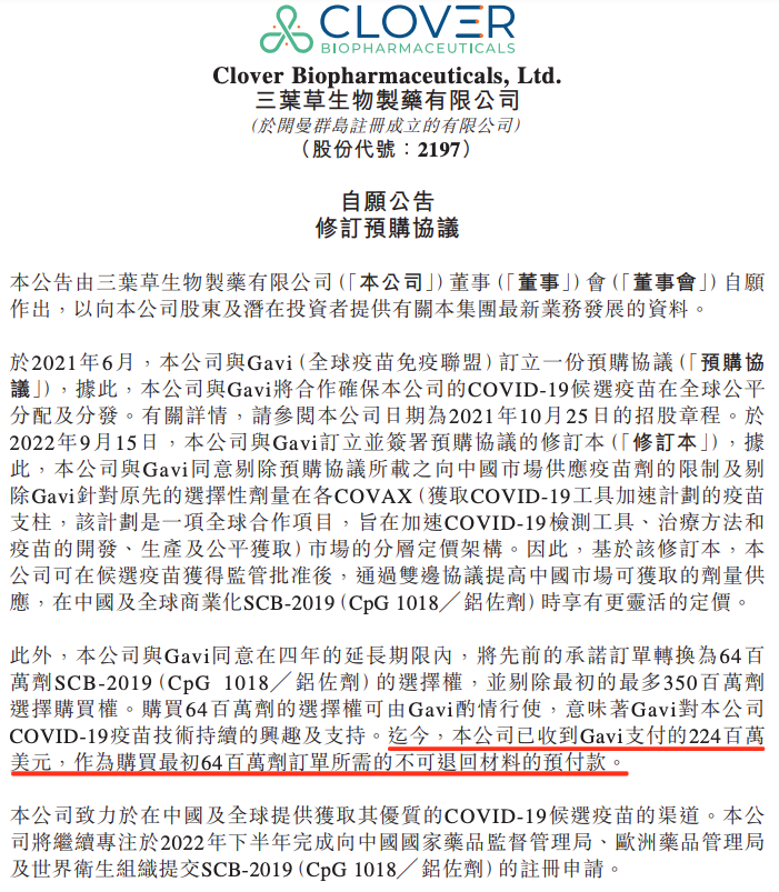 值得注意的是,公司披露称已收到2.24亿美元的不可退回预付款。更为关键的是,根据三叶草生物与Gavi在2021年6月最初签署的预购协议显示: